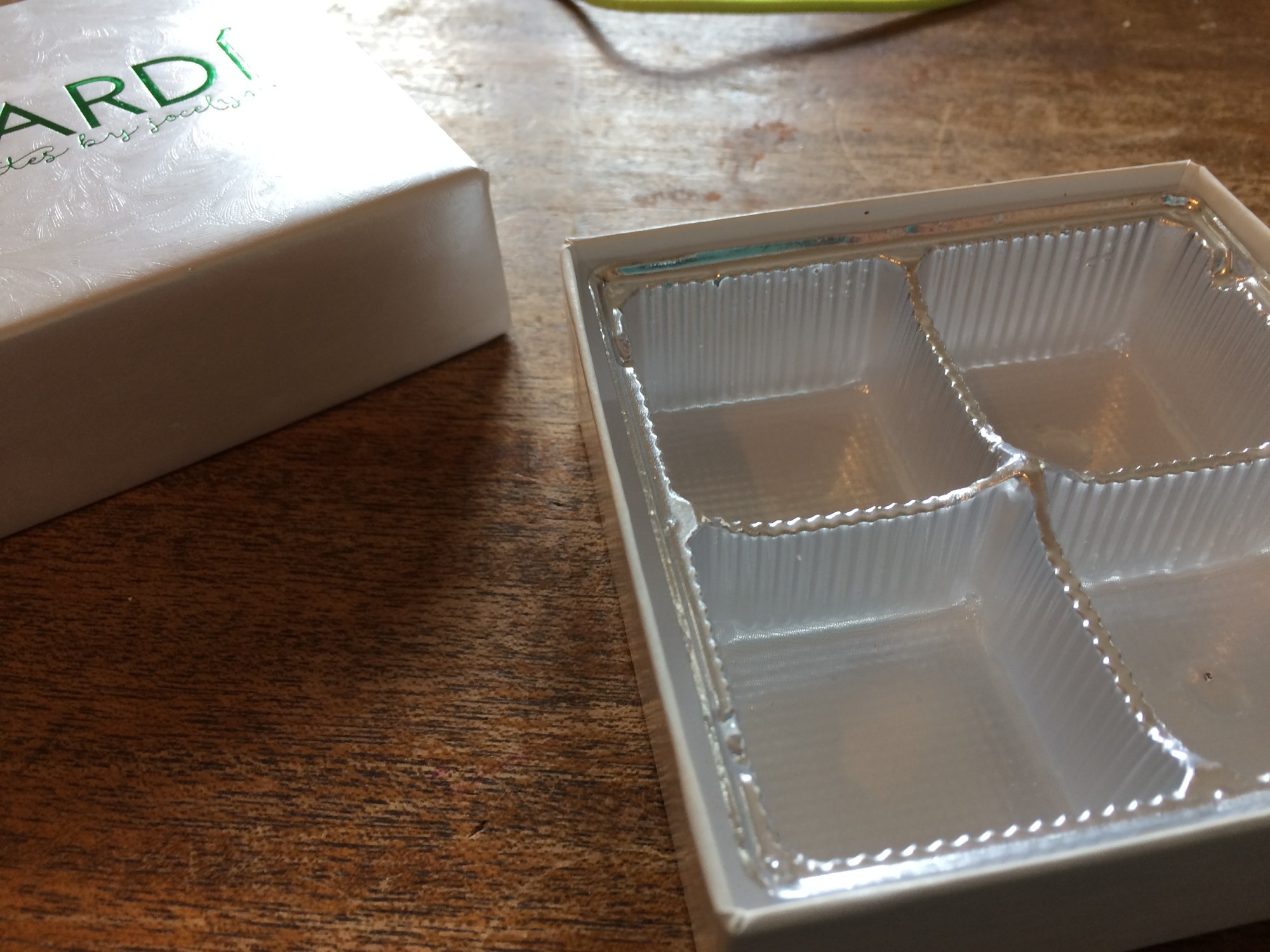 I walk to the counter and am enjoying all the fun things on display. The cashier rings up the purchase and begins wrapping it in crinkly brown tissue. I love crinkly brown tissue. To my left is a pyramid of small white boxes with a hand-written note above them that reads “Locally made.” I am intrigued and reach for the box to see what they mean by “local.” The lid to the box quickly comes off the box, and I am left holding it and looking down in shock. Four artisan chocolates have fallen from their box. One rolled under the cash register still another under a rack of earrings. The paper doilies holding the chocolates have fluttered to the floor and across the counter. I am in shock. It’s a Russell Stover explosion. I didn’t even realize it was a box of chocolates or that it would all open so easily. I am the bull in the china shop and immediately offer to pay for the box I just spilled. There was no way to re-box and re-sell this mess. The cashier says, “Oh. It’s no problem. They are delicious” and adds them to my total. “That will be $73.13.” “Wait, what? Is this a $50 box of chocolates?!” She laughs and tells me she made an error entering something. Well, that’s a relief. I get my new total, and still feel stunned by the price. $11 for four chocolates. Wow. Old butter fingers here just bought some pricey nibbles. I would’ve rather had a couple 6 packs of San Pellegrino, that’s for sure.